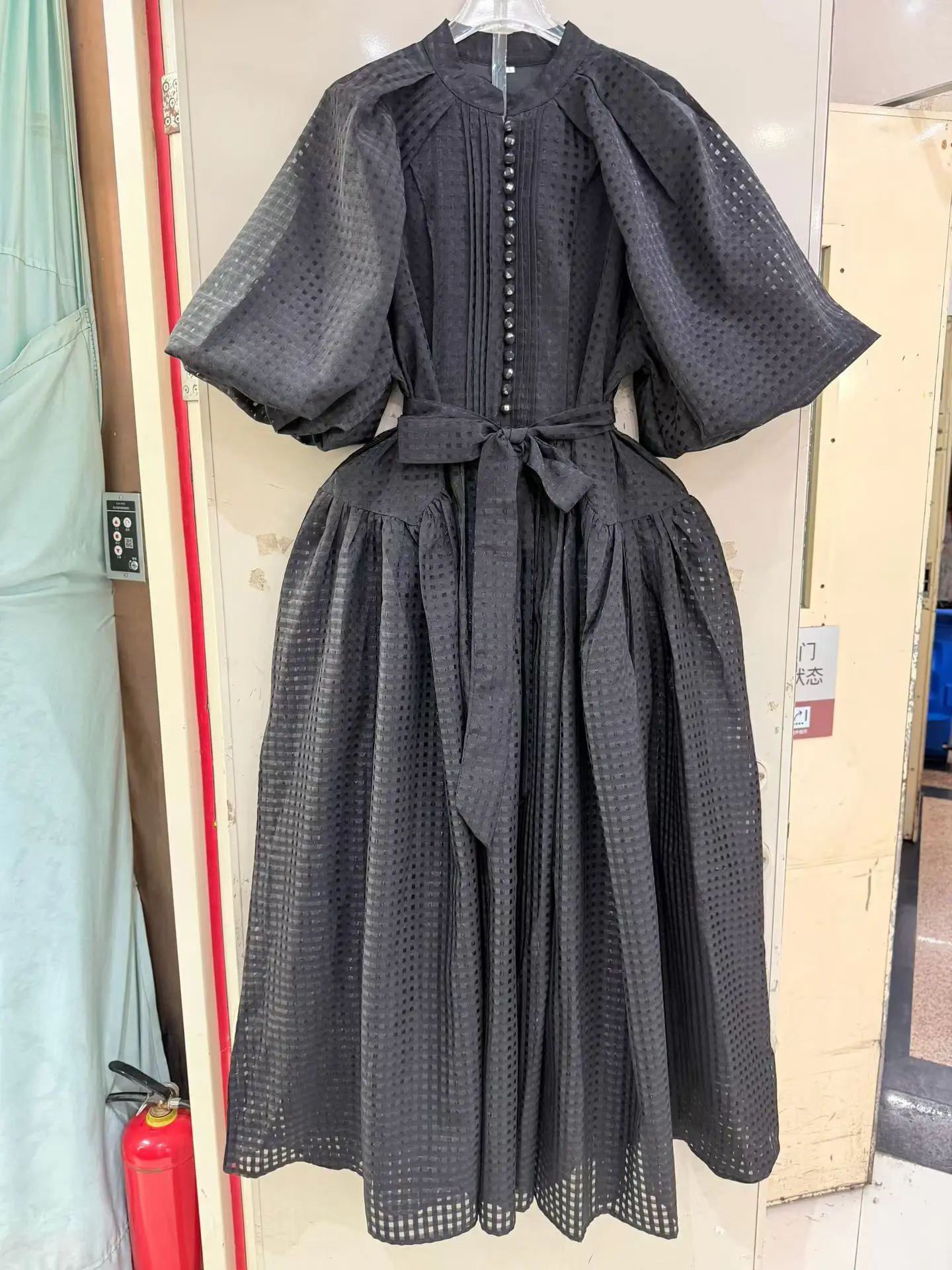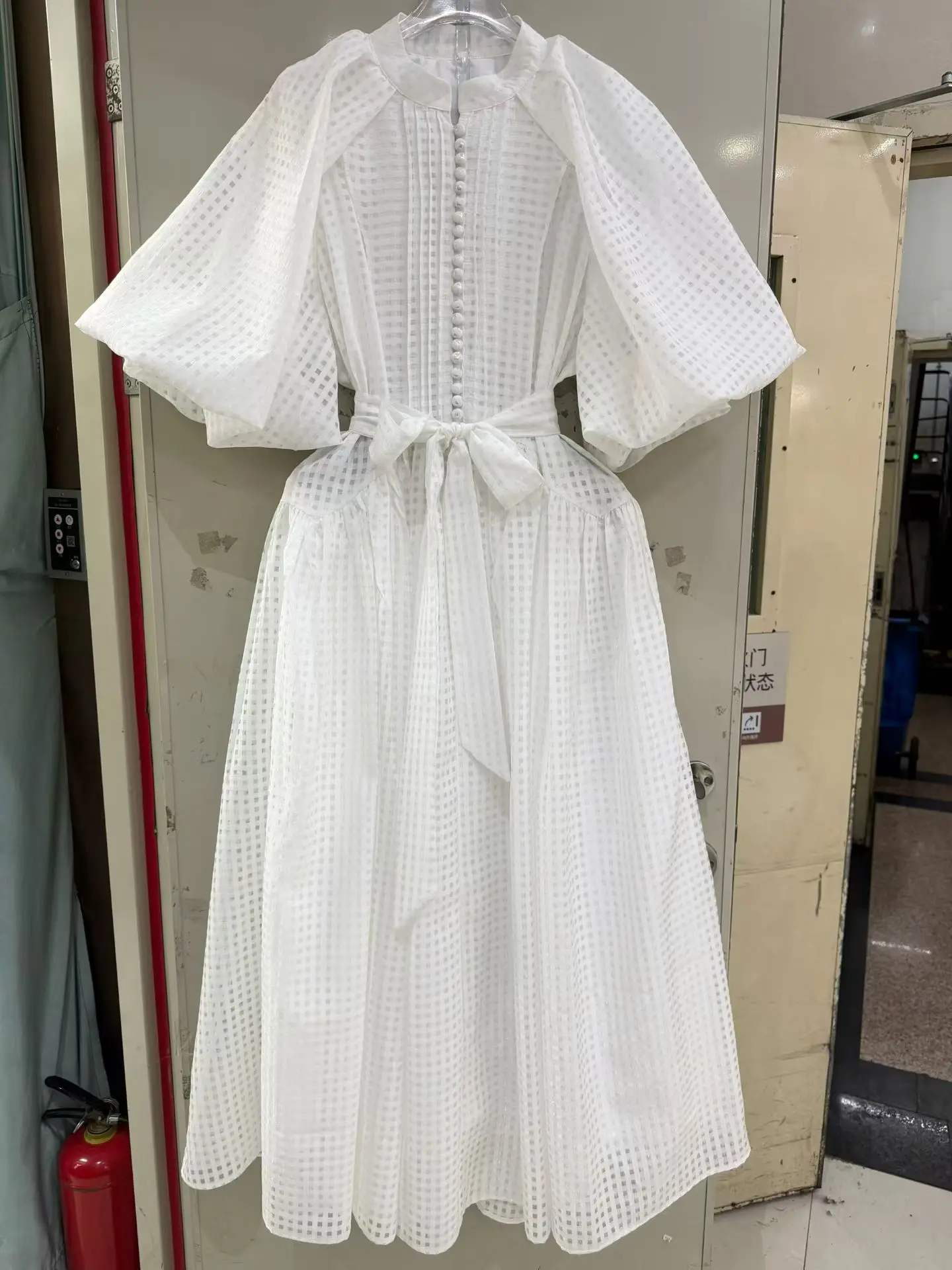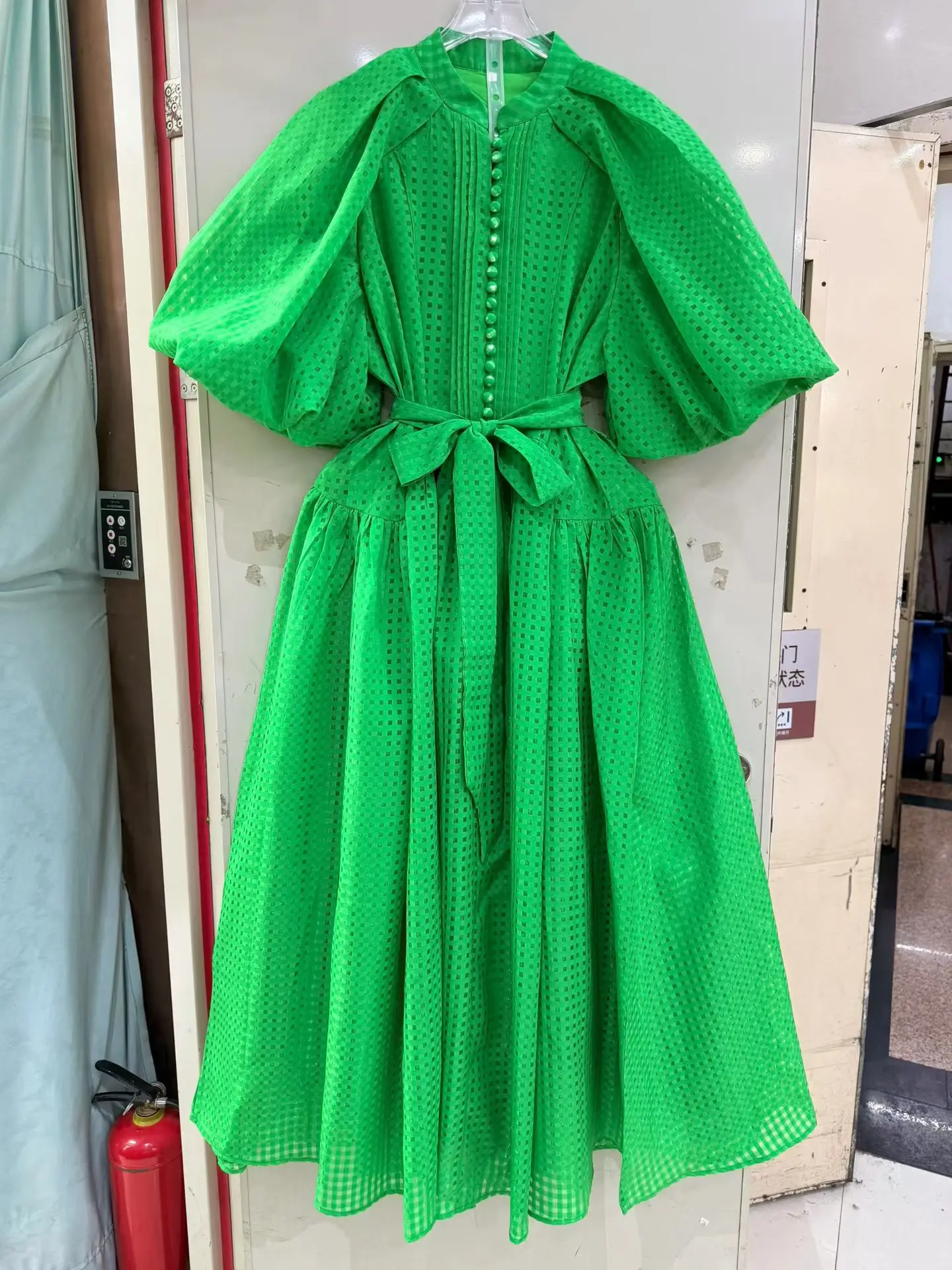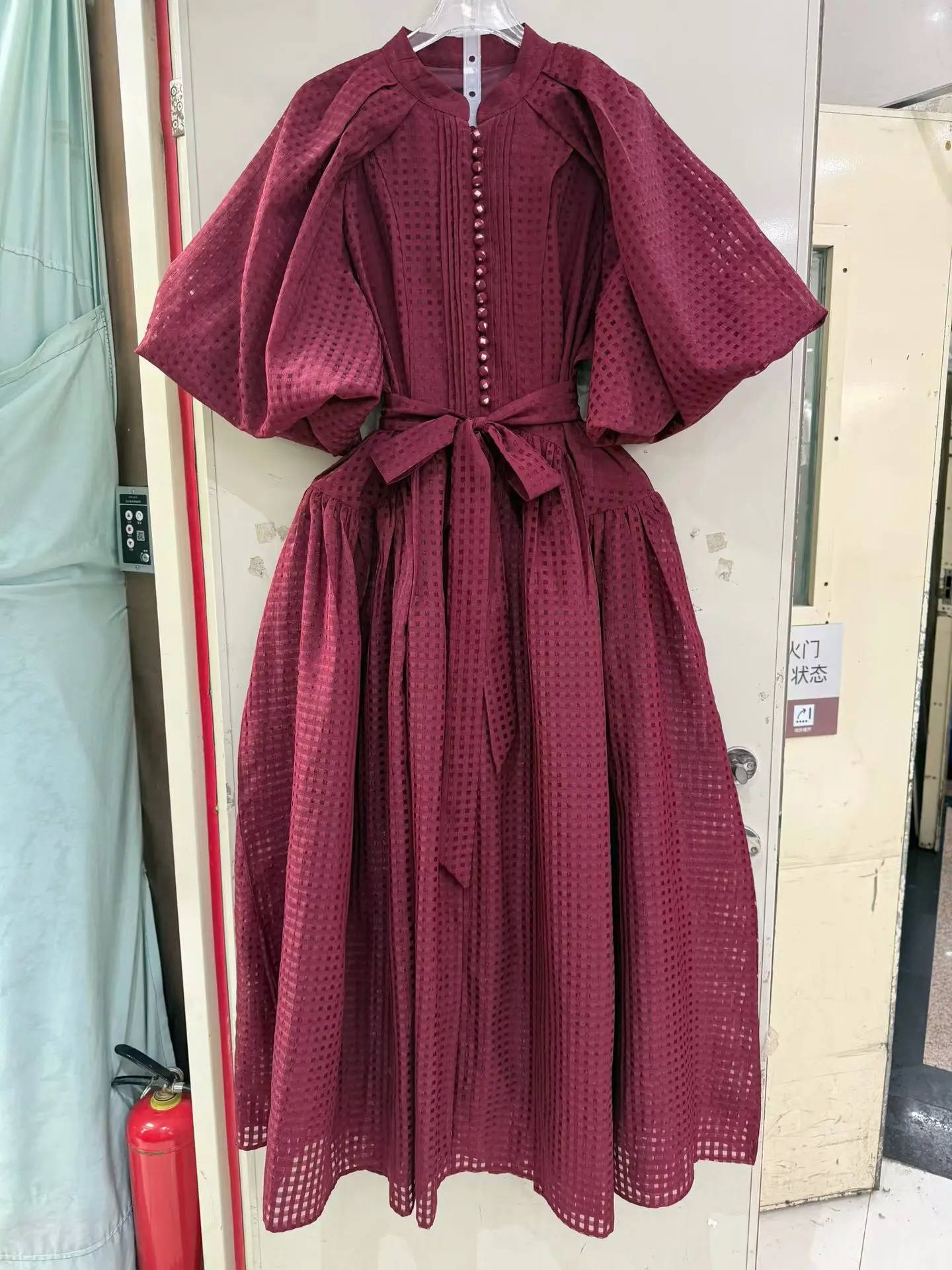 Factory Wholesale Vacation Casual Mini Dress Women Spring Summer Puff Sleeve Luxury Plaid Belt Midi Loose Oversize Party